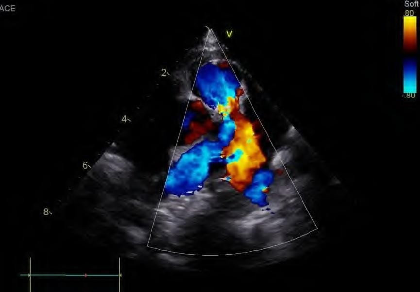 The final echocardiogram showed Pulmonary Artery banding with a max PG of 35 mmHg (mean 17.6 mmHg), small residual flow from the left to right by the ventricular septal defect closure device, and a second apical muscular ventricular septal defect with left-to-right flow with a PG of 24 mmHg, 1+/4+ regurgitation of the left atrioventricular valve with a PG of 75 mmHg, and an intact atrial septum. (Figure 2)