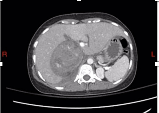 A 29-year-old young female presented to emergency department (ED) with right sided abdominal pain and fever for 2 days duration. She denies any urinary symptoms, including hematuria and no sexual encounters. Initial examination Urine hCG was negative. She had an emergency laparotomy for ruptured ectopic pregnancy. She denies the history of jaundice, weight loss, alcohol use and hepatotoxic drug intake. On examination, she was alert and conscious with the Blood pressure of 90/60 mmHg. She is not pale or icteric. Abdominal examination revealed a ballotable right renal mass.