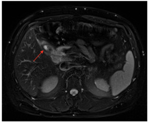 Initial computed tomography scan (CT) showed a thick-walled cystic structure containing stones in the gallbladder fossa which was indicative of chronic inflammation (Figure 1). Subsequent magnetic resonance cholangiopancreatography (MRCP) displayed evidence of a remnant gallbladder containing a 6-mm calculus (Figure 2). Patient was then scheduled for an elective robotic-assisted laparoscopic cholecystectomy for removal of the remnant gallbladder.