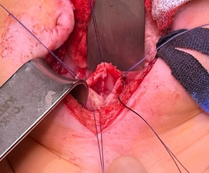 Once our patient reached 4 months old, the final surgery —a combined abdomino-perineal vaginal pull-through with septum resection— was performed by our department (figure 2). Following the procedure, a catheter was placed in the neovagina to prevent stenosis of the newly created vaginal canal and to ensure safe drainage of secretions. Antibiotic prophylaxis with cotrimoxazole was discontinued, and metronidazole along with cefotaxime was administered perioperatively. The catheter was removed after one week, with a follow-up scheduled to initiate regular neovaginal dilations. A new catheter was then reinserted and left in place for another week. Frequent follow-ups were performed with regular dilatation of the neovagina to avoid stenosis.