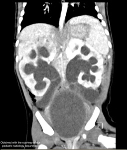 Due to severe dehydration, the patient was admitted to the pediatric intensive care unit (PICU) and started on intravenous fluids. Meanwhile, a rapidly growing mass was observed in the lower mid-abdomen. An ultrasound scan showed a massive cystic mass in the abdomen with severe urinary obstruction. A subsequent CT scan revealed a markedly enlarged renal pelvis with reduced renal perfusion, bilateral megaureters, and a 9 x 5 cm cystic septated structure. (figure 1). The outer genital showed normally developed labia but no vaginal entrance. An exploratory laparotomy revealed an enlarged and protruding uterus. The ovaries and fallopian tubes were normally developed. Following uterine incision through the vagina, over 100 mL of purulent fluid was drained, and a Redon drain was placed. Immediately after drainage, urine began flowing through the inserted bladder catheter and intraoperative ultrasound showed a decrease in renal pelvic calyx dilatation. Uterine drainage analysis demonstrated a high cell count, mainly granulocytes. Uterine drainage grew Streptococcus anginosus, which led to the diagnosis of pyometra. In addition, urine culture grew Streptococcus anginosus and Escherichia coli.