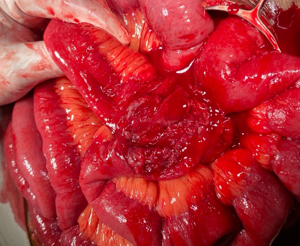 A 29-year-old previously healthy male presented to the emergency department with a 4-day history of lower abdominal pain associated with distension and vomiting. The pain initially began in the periumbilical region and later localized to the lower abdomen. It was constant, moderate to severe in intensity, and aggravated by movement. He reported nausea and anorexia but no diarrhea or constipation. There was no history of abdominal trauma, tuberculosis, peptic ulcer disease, or prior abdominal surgery. He denied alcohol consumption or smoking and had no family history of bowel disease.