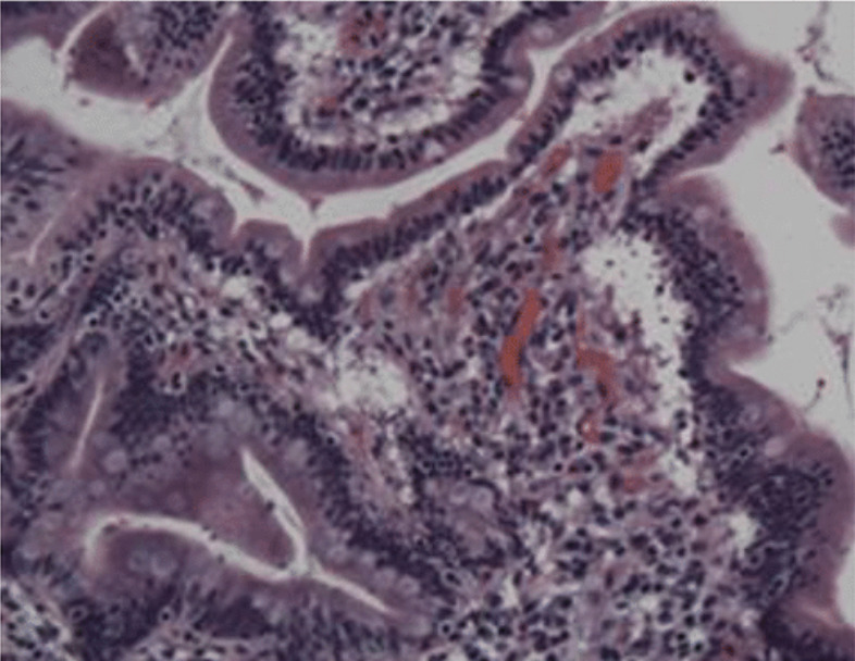 The patient had an uneventful postoperative recovery. Nasogastric tube was removed on postoperative day 2, and oral intake was resumed on day 3. The drain was removed on day 5, and the patient was discharged on day 6 in good condition. Histopathological examination of the resected segment revealed a true diverticulum containing all layers of bowel wall with focal ulceration and acute inflammatory exudate at the perforation site. There was no granulomatous inflammation, dysplasia, or malignancy. At 3-month follow-up, the patient remained asymptomatic with normal bowel habits and weight gain.