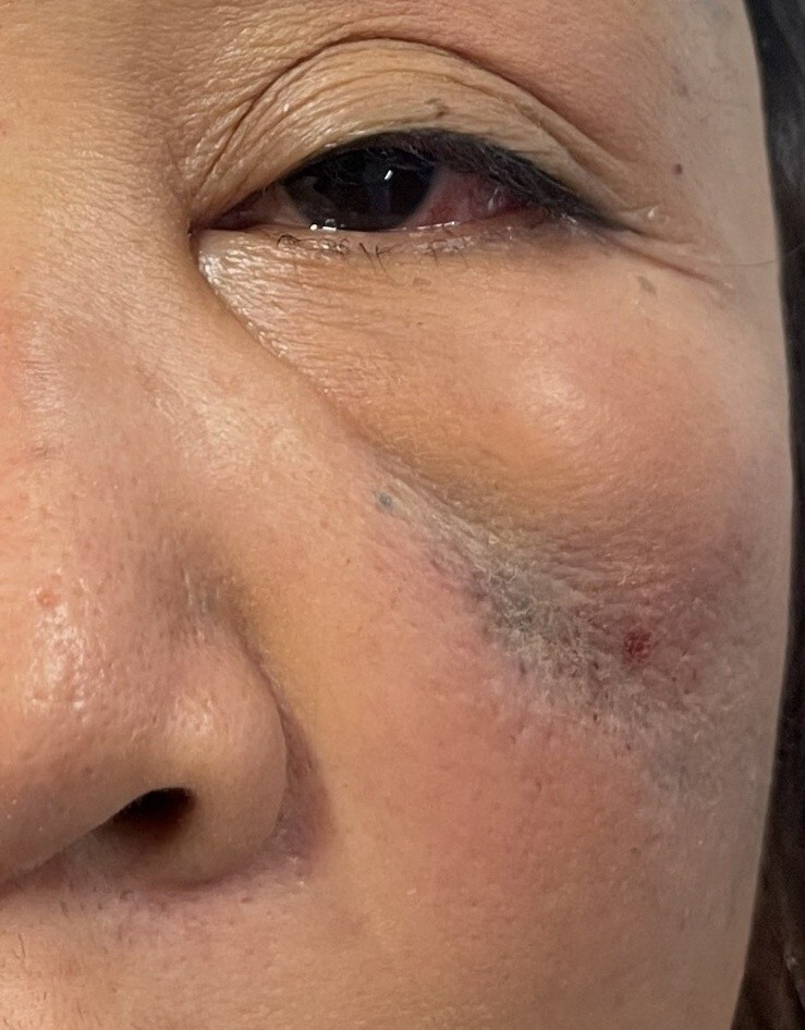 55-year-old female presented to an ophthalmologist with sudden vision loss in her left eye following self-injection of cosmetic filler to both lower eyelids and infraorbital areas. She had injected PDLLA subdermal filler (AestheFill; REGEN Biotech, Inc., Seoul, South Korea) four hours prior and reported immediate painless vision loss in her left eye following injection. On examination, best-corrected Snellen visual acuity (BCVA) in the right eye was 6/9 and in the left eye was count fingers (CF) at 1 meter. Intraocular pressure (IOP) was normal bilaterally. As seen in Figure 1, periorbital oedema and ecchymosis with mild left blepharoptosis were evident. Pupils were equal and reactive with a dense left relative afferent pupillary defect (RAPD). Extraocular eye movements were preserved. There was mild conjunctival hyperemia, a clear cornea, quiet anterior chamber and a moderate cataract. On dilated fundoscopy, as seen in the ultra-wide field fundus image in Figure 2, findings were consistent with a central retinal artery occlusion with multi-territory macular ischemia.