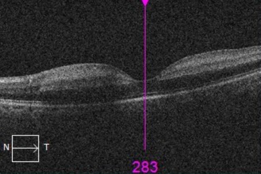 Optical coherence tomography of the left eye demonstrated increased retinal reflectivity and inner retinal thickening (Figure 3). Vital signs were within normal limits. No other focal neurological deficits were noted.